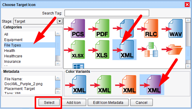 In the Categories field, click on the File Types and select the XML icon in the main field. Choose the desired color of the icon. Click Select.