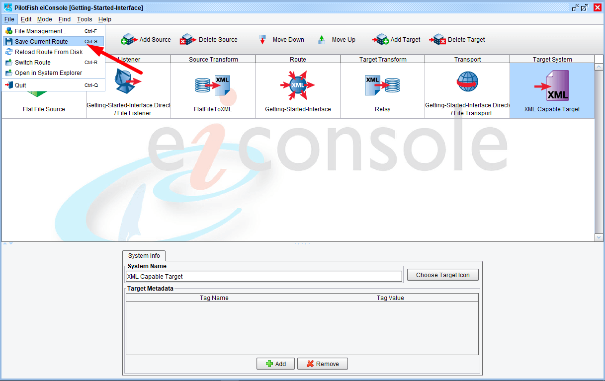 Now that the Source System and Target System have been defined, go to the File menu and click Save Current Route.