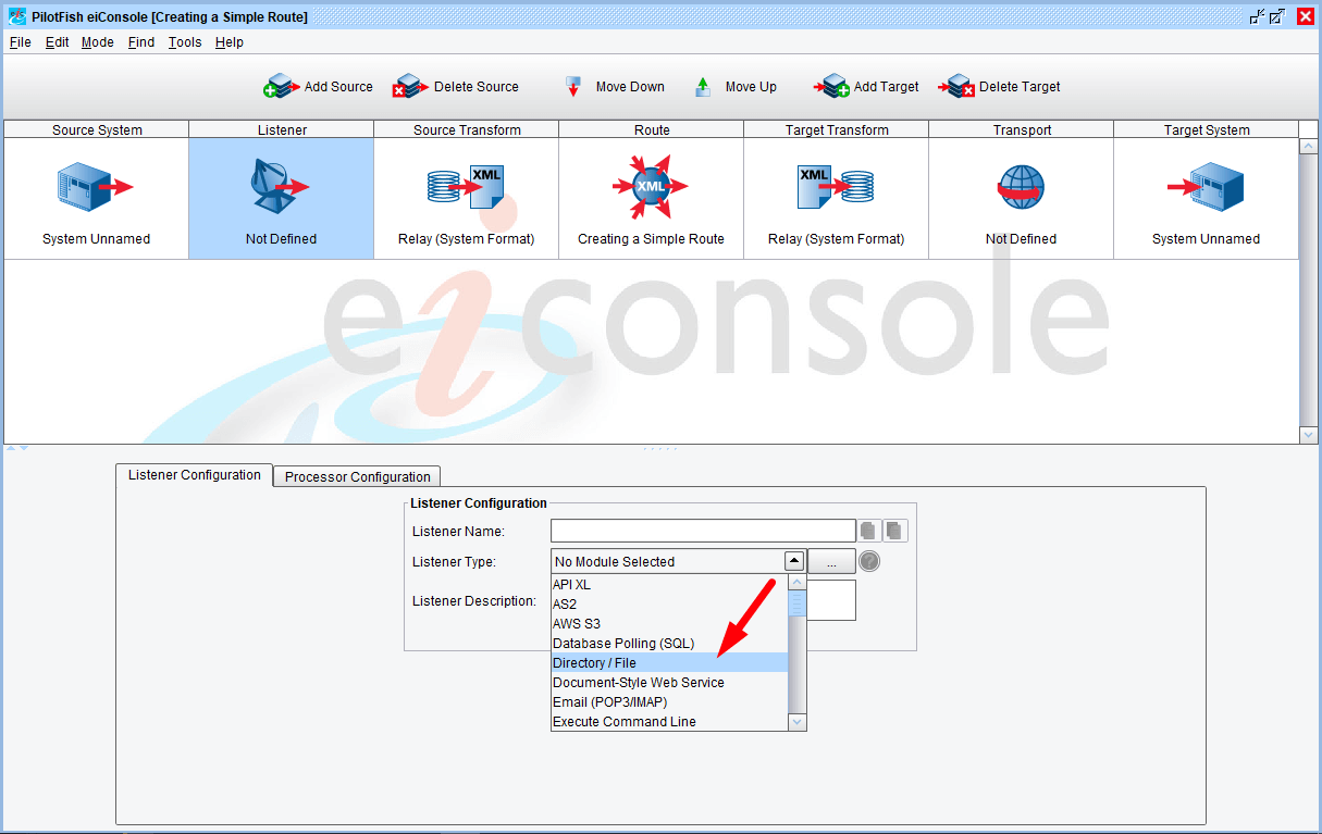 You will notice the bottom half of the screen now has a “Listener Configuration” tab, which should be selected automatically. Now we need to pick a Listener from the Listener Type drop-down. Select “Directory / File”:
