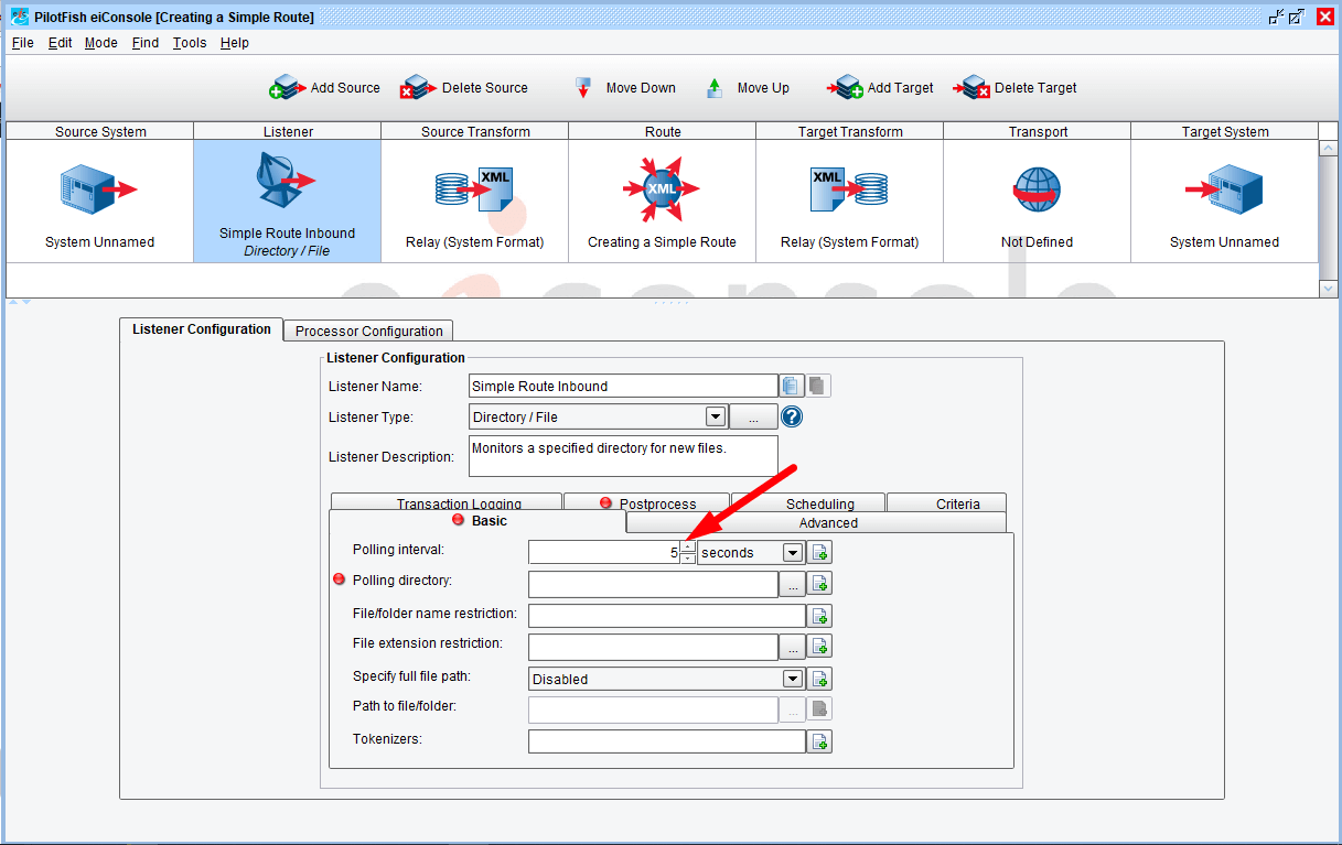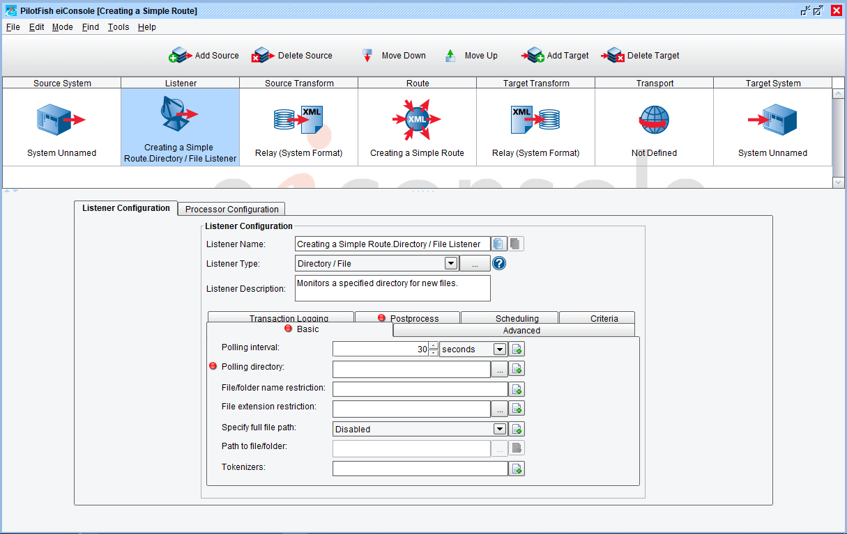 Next we’ll need to configure our Listener. Most modules require some configuration. Items that are required (such as the “Polling Directory” items for this Listener type) have a red dot next to them if they’re not yet configured. For our Listener, we’ll need to specify a directory on the file system to check for new files, as well as how often we’ll check that directory. Provide “5” for the “Polling Interval” value: