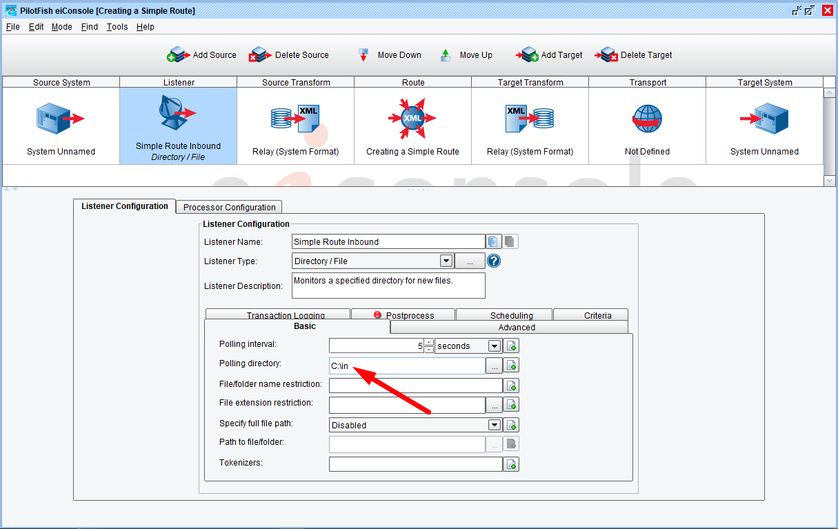 We’ll now configure the “Polling Directory.” Because this is an exercise, we recommend creating a new directory somewhere on your computer to pick files up from. We’ll be using “C:\in”. Note that the directory you specify must exist. You may type the path manually or use the “…” button to browse to it:
