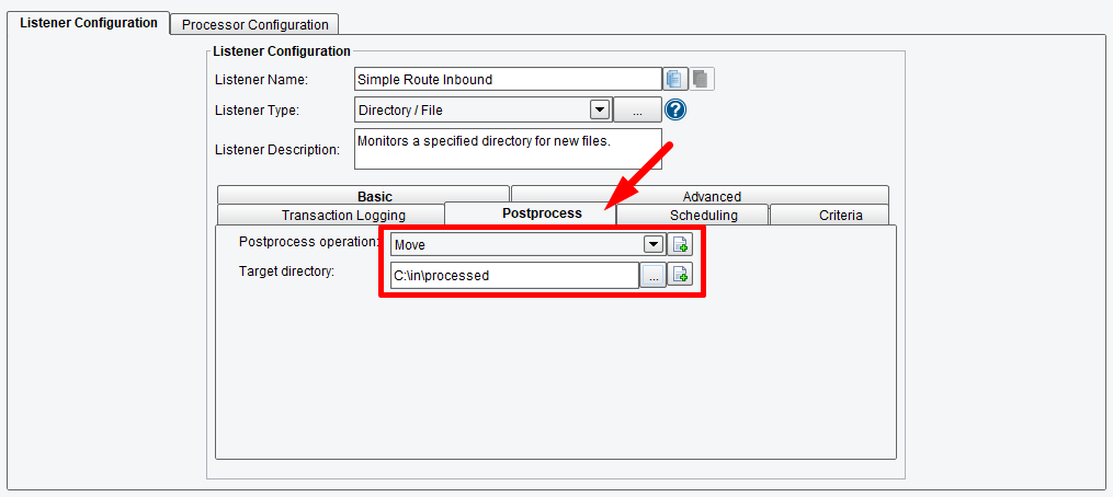 We’ll specify the behavior of the system after a file has been picked up. You can Keep, Delete or Move the file. If you choose to Move a file, the Target directory becomes required. This allows you to specify the directory to use for the processed files.