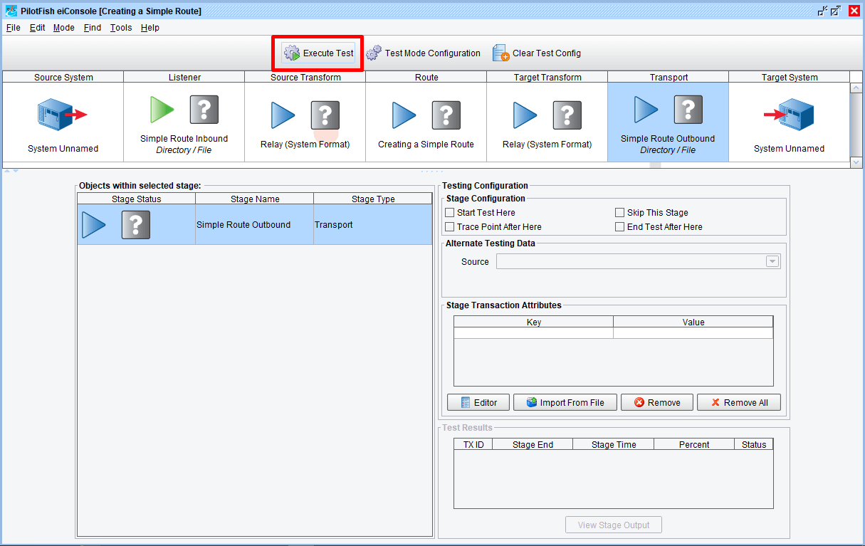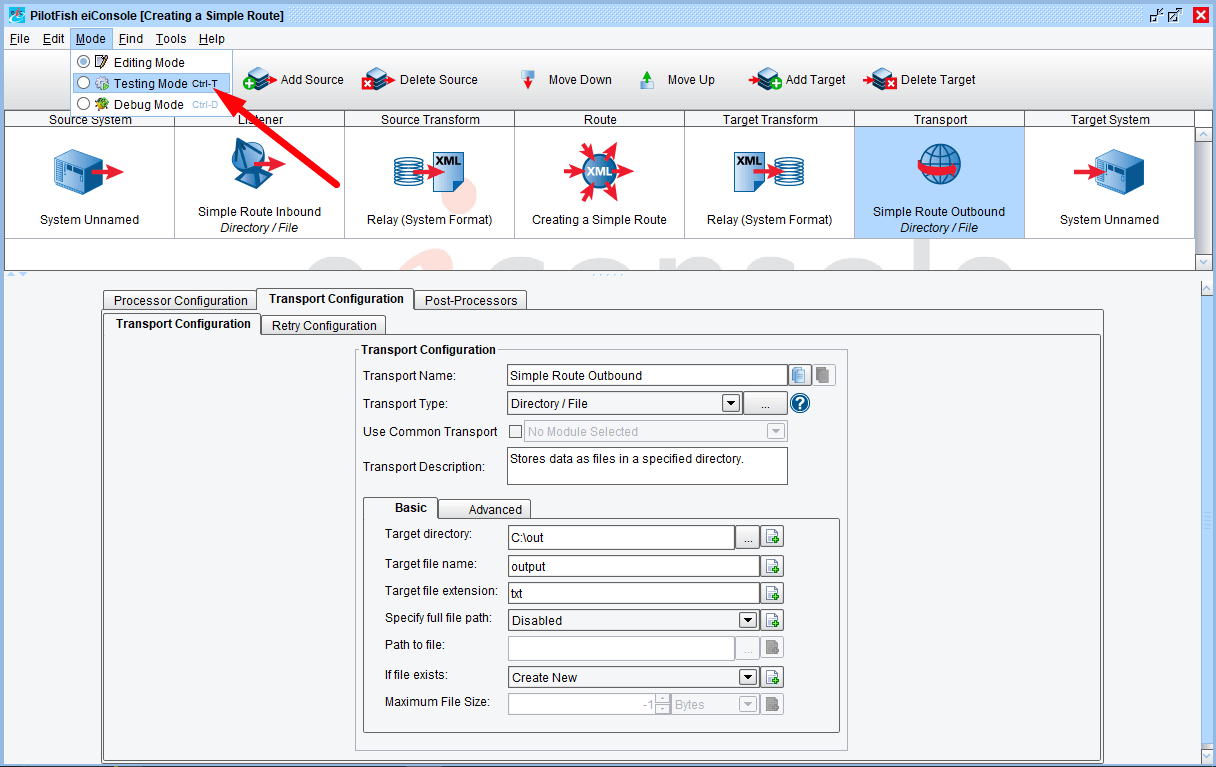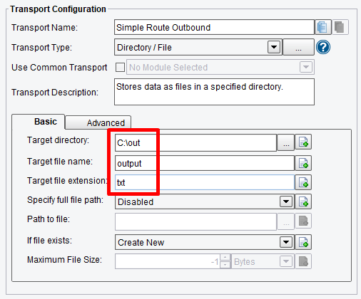 As you can see, there are a couple of required items for the Directory Transport. “Target Directory” is the directory we’ll be creating a new file in, “Target File Name” is the name (minus extension) of the file to create, and “Target File Extension” is the extension of that file. For our example, we’ll populate these as “C:\out”, “output”, and “txt”: