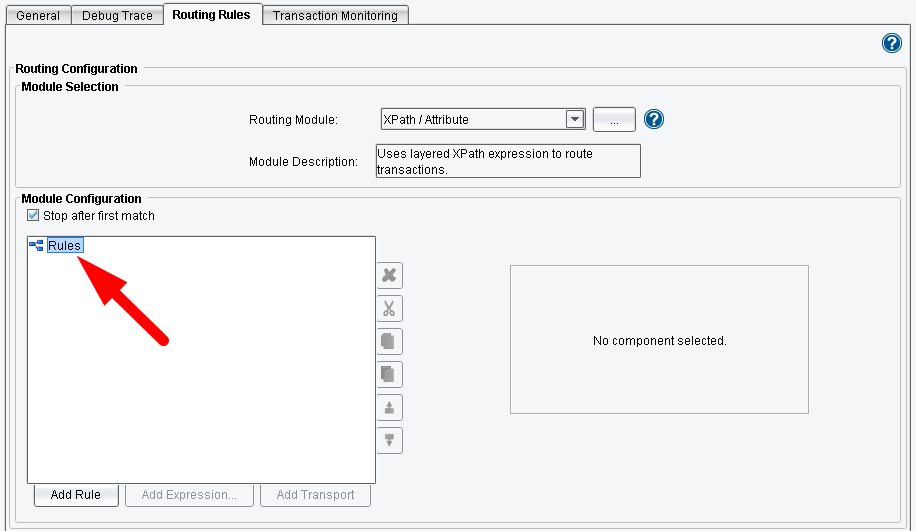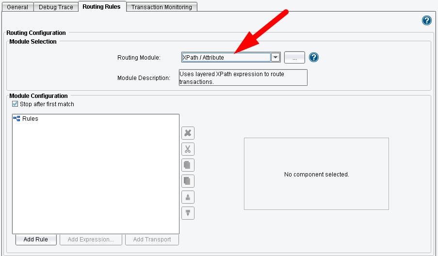 To configure an XPath based Routing Module, select XPath/Attribute from the Routing Module dropdown. In the Module Configuration area, a tree will appear. At first this tree will only contain a rules node.