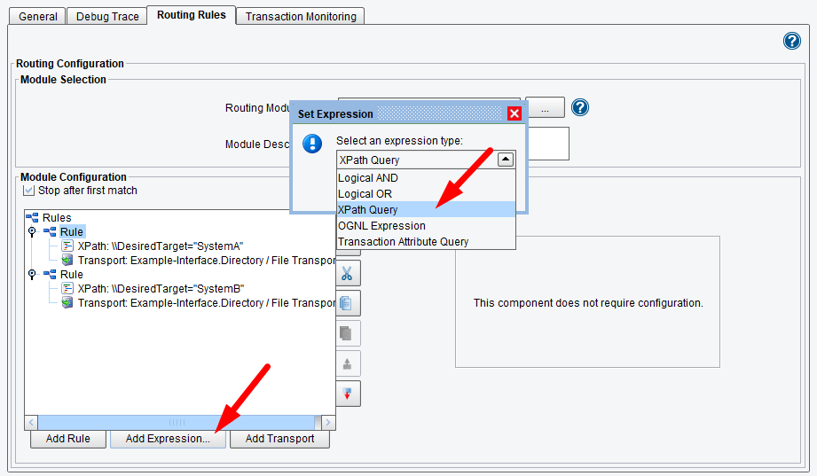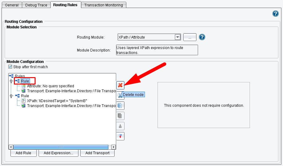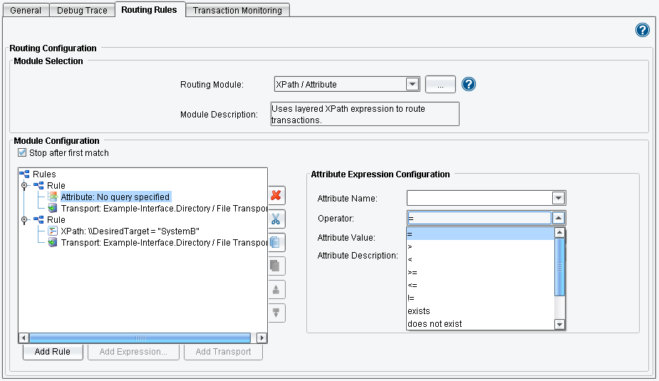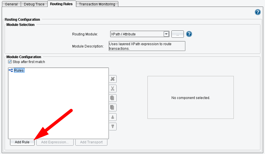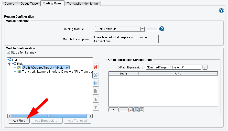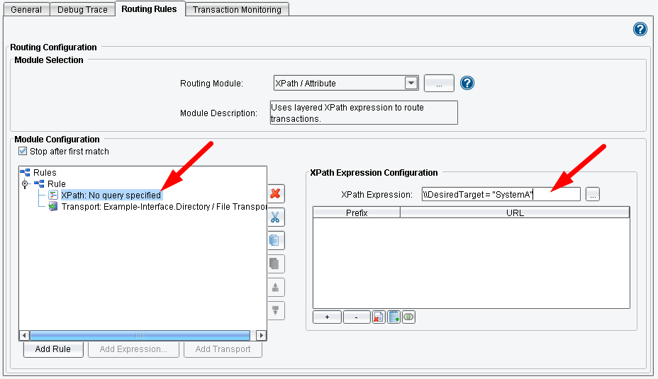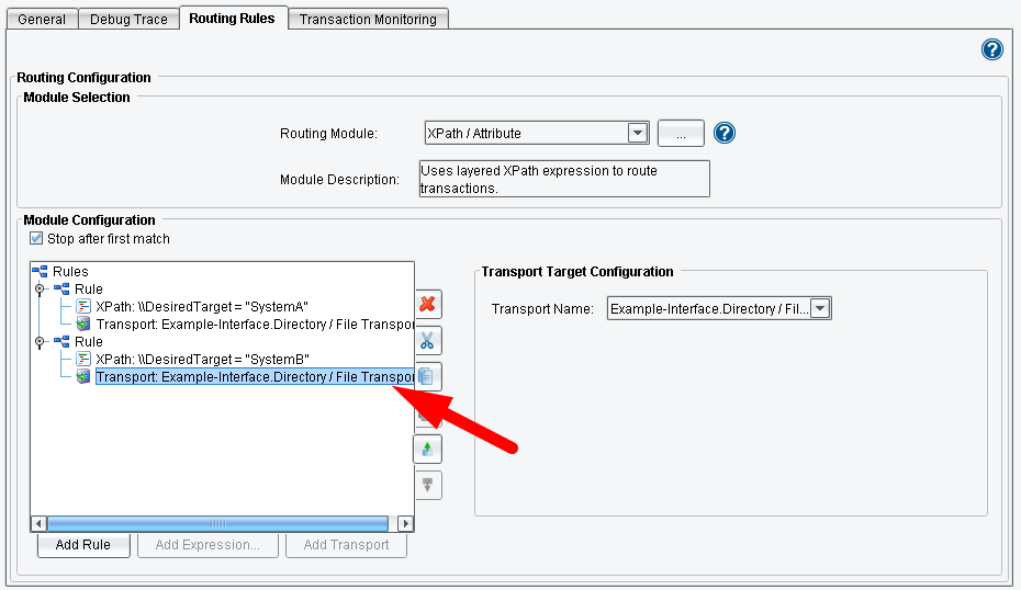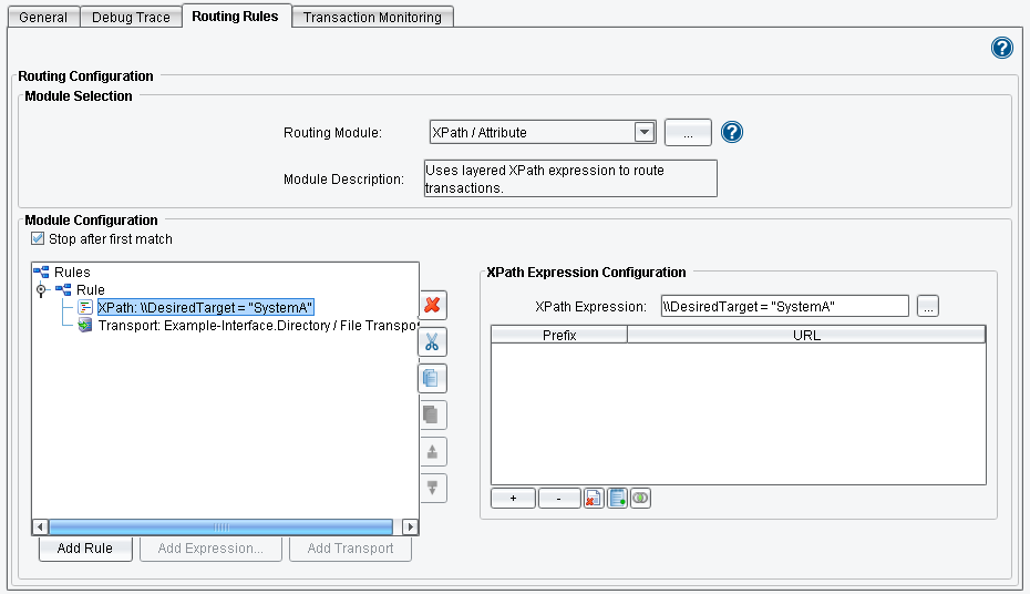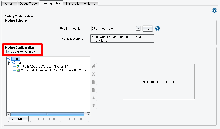 When the route node of the Module configuration tree is selected, you’ll see that you have the option to stop after the first match. If you wish for the data to be sent to multiple target systems, you will want to uncheck this. This means that all XPaths will be evaluated and all XPaths that are returned true will have their transports invoked. When this is left checked, only the first rule that returns true will be invoked. Only that transport will be used.