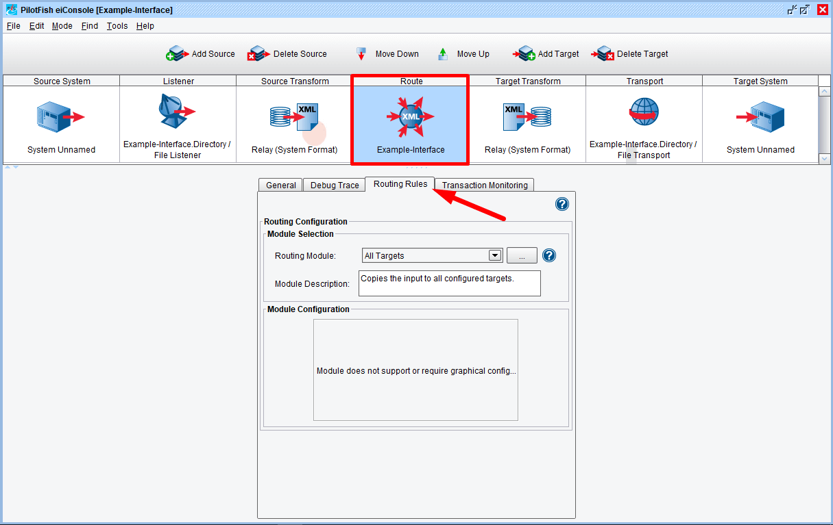 The eiConsole comes bundled with three out-of-the-box Routing Modules. The simplest of these, and the default, is the All Targets. This Module will take any inbound message and send it to each defined target system.