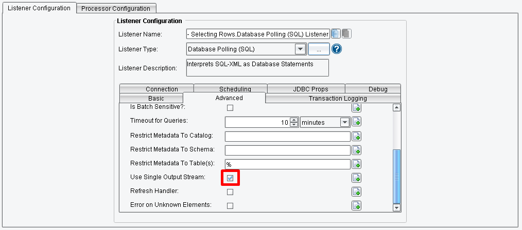 This will cause all selected rows to come back in a single eiConsole transaction. Unchecked, and by default, the Listener will produce a separate transaction for each row selected.