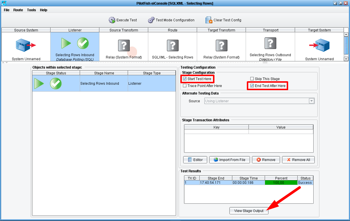 Save the route and switch to the eiConsole’s Testing Mode and execute the test at the Listener stage,