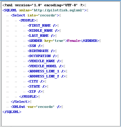 The Select instruction should now create a SQL query fetching the various provided columns from the PEOPLE table. The results will be stored in a variable called “records.” Now we simply need to output this variable to XML. To do so, we’ll add another instruction next to Select called “XMLOut” with an attribute called “var” specifying our “records” variable: