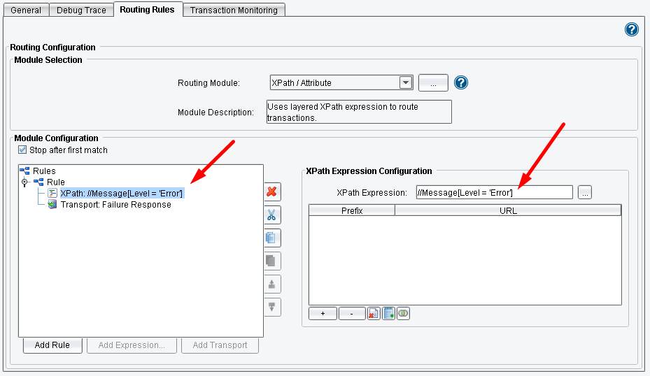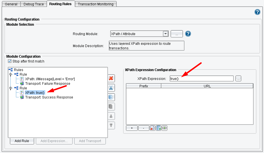 While this tutorial isn’t intended to cover routing, the premise is fairly simple: click on the “Add Rules” button to add a Rule. Each Rule has one type of expression (configured via drop down menu) and one or more Targets associated with it. Our first Rule will use a “XPath Query” as an Expression and “Failure Response” as a Transport.