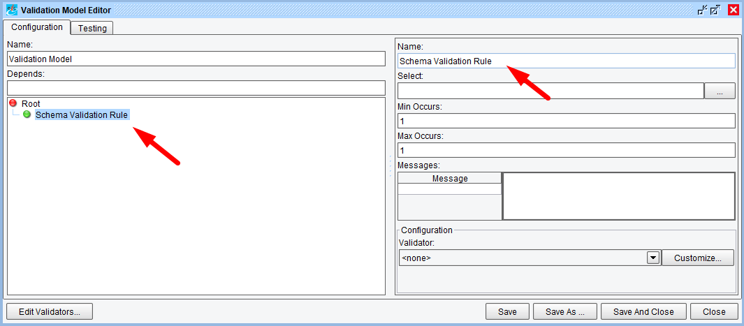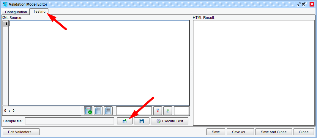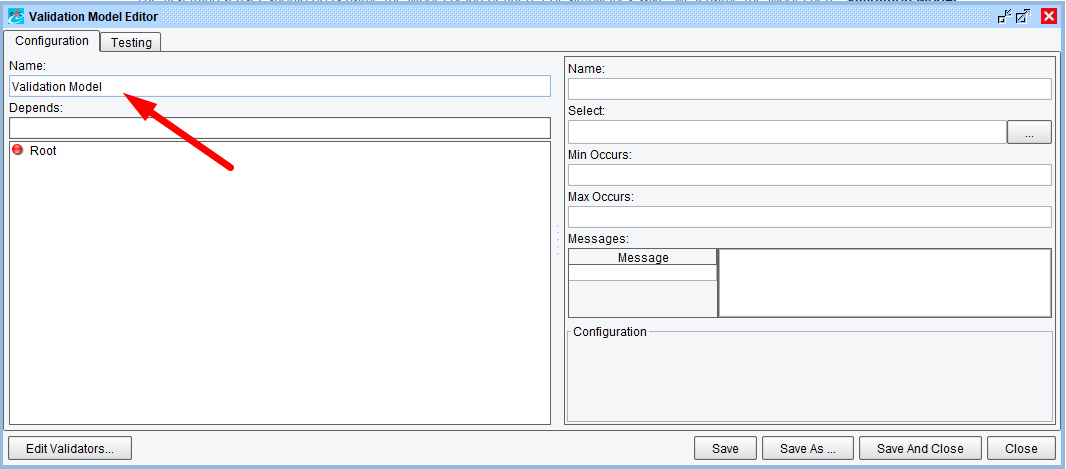 The Validation Model Editor is organized into “Configuration” and “Testing” modes, which can be switched between by selecting from the appropriate tabs at the top of the dialog. Defined and available Validators can be configured via the “Edit Validators…” button at the bottom of the dialog, while the configuration can be saved or the Editor closed using the buttons at the bottom-right.