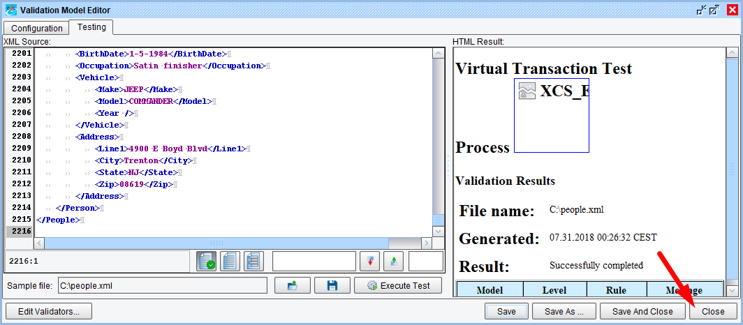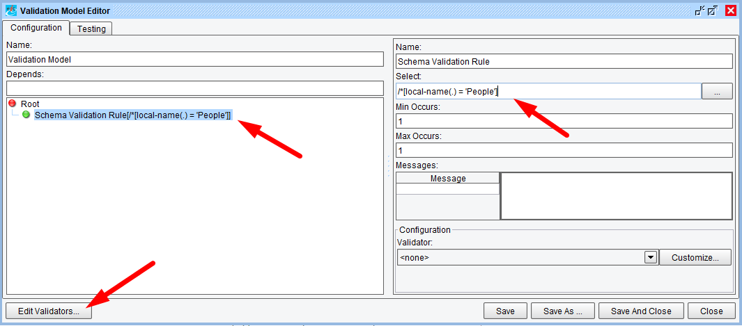 To test the Validation configuration, select the “Testing” tab at the top of the dialog, then load the provided “people.xml” sample: