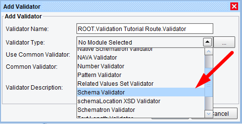 This dialog is similar in function to the Processors List dialog in the eiConsole. The user may add, remove and arbitrarily re-order Validators. To add a new Validator, simply click the “Add Validator” button to raise a dialog for selecting from available Validator types. We’ll select the “Schema Validator” for our purposes: