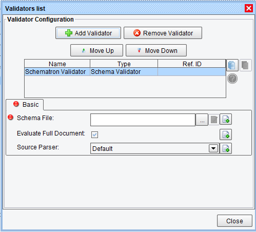 There are a number of Validators available out-of-the-box. Most of these vary between evaluating the given context node against some configuration (such as the “Date Validator,” which ensures that a node’s text content conforms to a date format) or evaluating the node or entire document against a more complex structure (such as the “Schema Validator,” “Generic XSLT Validator,” “Schematron Validator,” etc). The user therefore has the option of defining the validation entirely using the Model Editor and discrete Validators for each node within the Rule tree or passing the document in its entirety to existing artifacts, such as XSLT, XSD, and Schematron files.