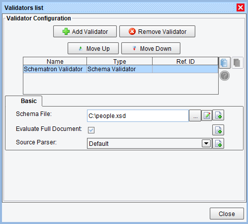 With the Schema Validator selected, the user may now configure it by providing a schema location and options regarding what portions of the source document to use as well as the model: