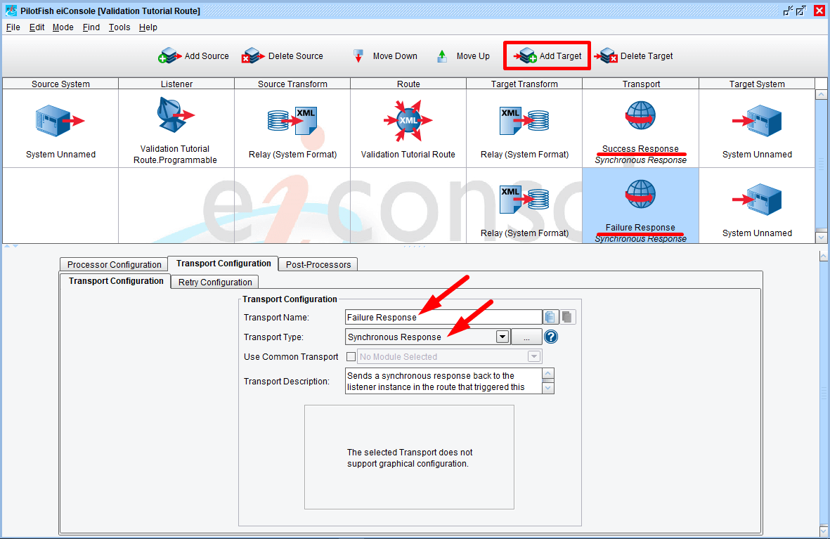 The next step is to configure the rest of the Route to handle the results of our Validation. We’ll start by defining two synchronous Targets: one for successes and another for failures. Both will use “Synchronous Response” transports; the only difference in this case will be their names – Success Response and Failure Response: